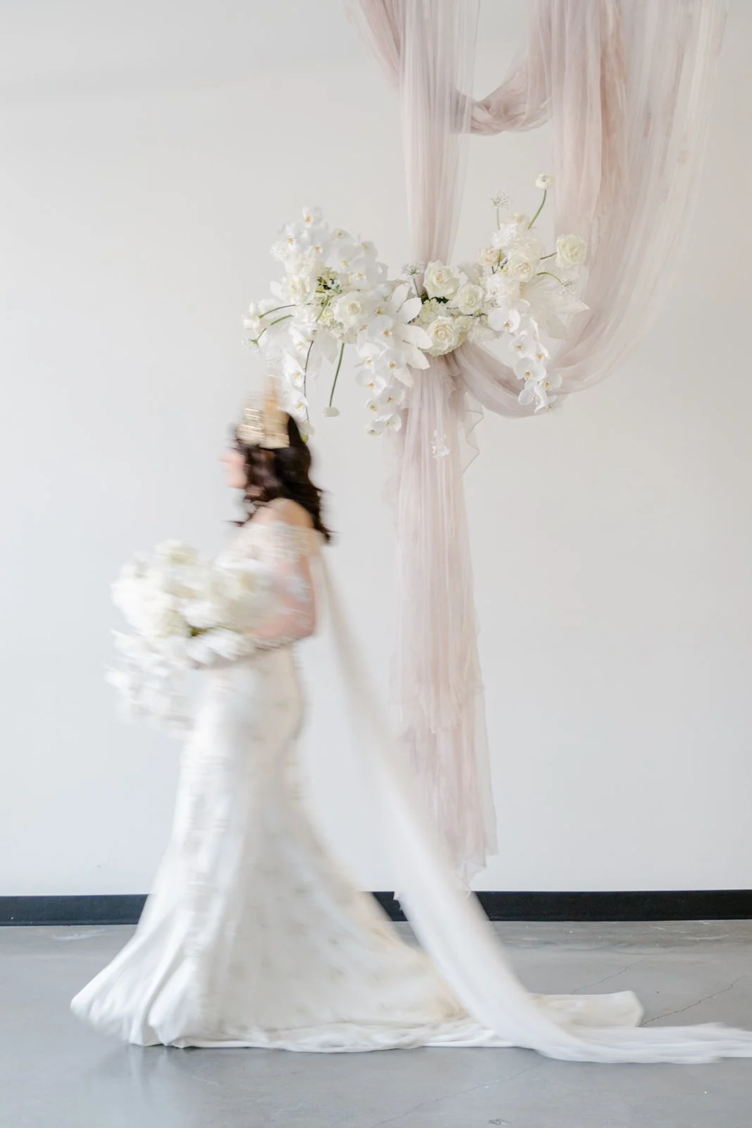 Our Rose Clay Tulle hand-dyed tapestries brought an ethereal and romantic ambiance to this stunning Indonesian-inspired styled shoot captured by Revel Photography. Taking inspiration from both Indonesian and Western wedding influences, Melissa Dawn Event Designs styled the shoot with gorgeous gold and cream details. The bride Kylie’s Indonesian and Canadian heritage, which she payed homage to in both her real wedding and this styled shoot, brought a beautiful meld of cultural heritage and modern minimalism. The Brownstone in Calgary, Alberta was the perfect venue for this stunning fusion editorial. From the gorgeous flower arrangements by Hen & Chicks, to the sophisticated stationary by Pink Umbrella Designs and the classic table detailing with pieces from Modern Rentals, every aspect of this styled shoot combined to create a cohesive, elegantly neutral look. Kylie’s bridal attire included a traditional Sunting, a crown sourced directly from Indonesia. Over the minimalist Theia Couture Lindsay Dress from Bisou Bridal, Kyle wore a traditional custom lace kebaya, crafted by Irvan Adiputra in Jakarta. Leeanne Pilkington Makeup Artistry tied the whole bridal look together with elevated hair and makeup.